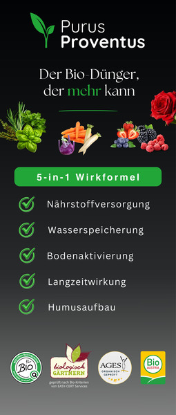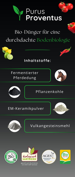 Qualität, die man sehen, fühlen und schmecken kann. Purus Proventus ist 100 % natürlich, zertifiziert für den Biolandbau und frei von jeglichem industriellen Müll. Es ist die ehrlichste Art, Deinem Garten „Danke“ zu sagen.